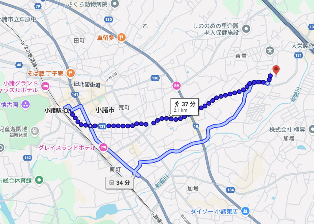 場所は小諸市の中心部から近く、JR小海線・しなの鉄道線「小諸駅」から徒歩約40分ほどと少し離れており、駅から徒歩へのアクセスはしづらい場所にあります。