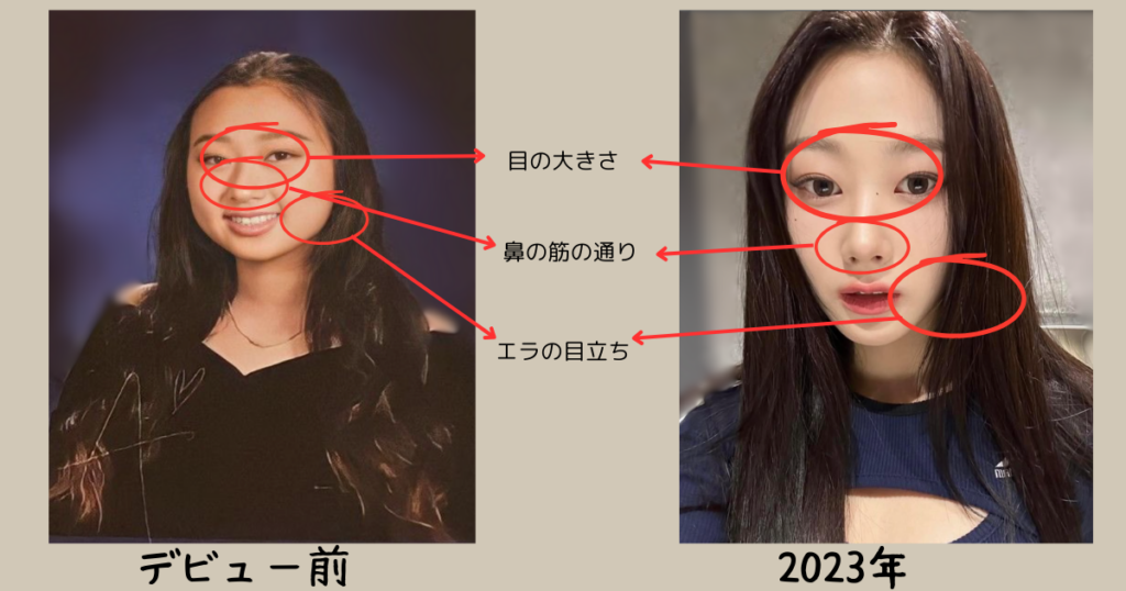 現在はデビュー前(2020年頃)と比較すると鼻筋が通った印象やエラの張りが抑えられたとの分析があり、全体的にスマートになったとされます。