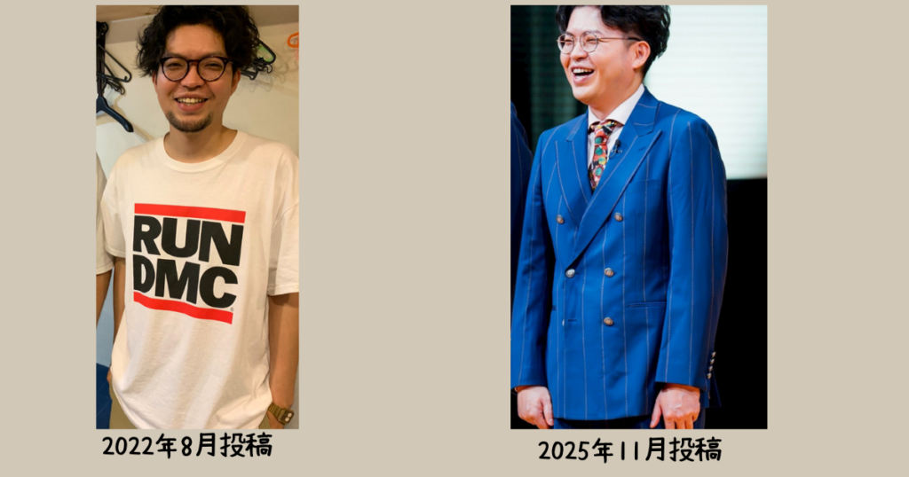 また、最近では2025年12月19日のTOKYO MX「5時に夢中!」に出演した際、相方の楢原真樹さんから「会った時から15キロ太ってる」とイジられ、ぽっちゃり変化を認めていました。
