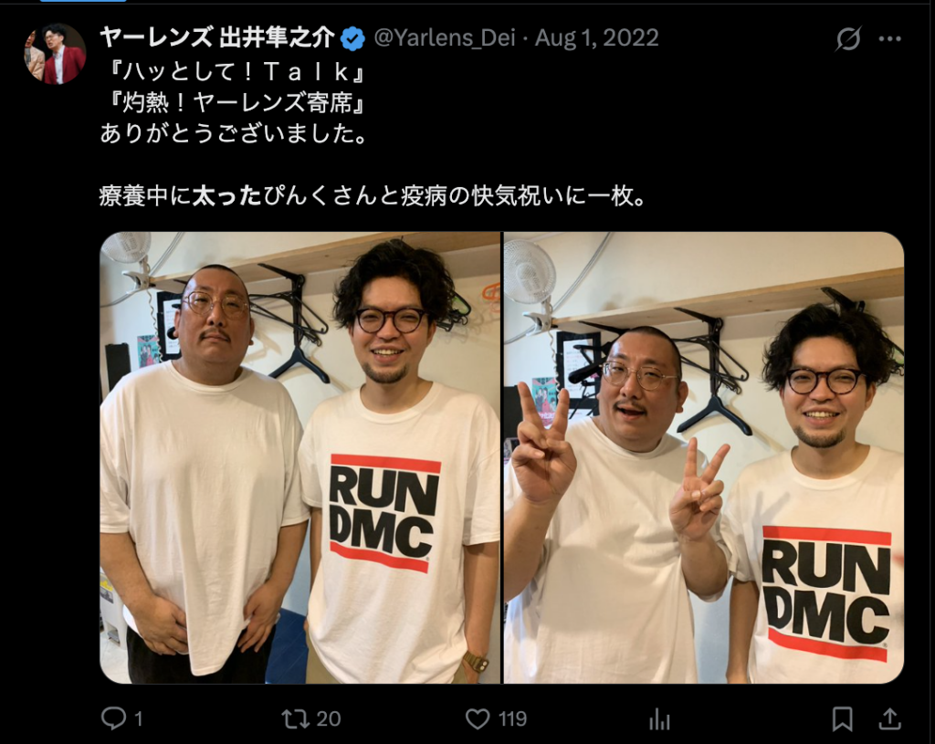 しかし、2022年8月1日にXには、療養中に太ってしまったピンクさんとの写真をポスト。