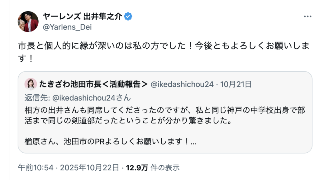 しかし、滝澤池田市長と同じ中学で、同じ部活だったことが本人のポストと池田市長のポストで明かされています。