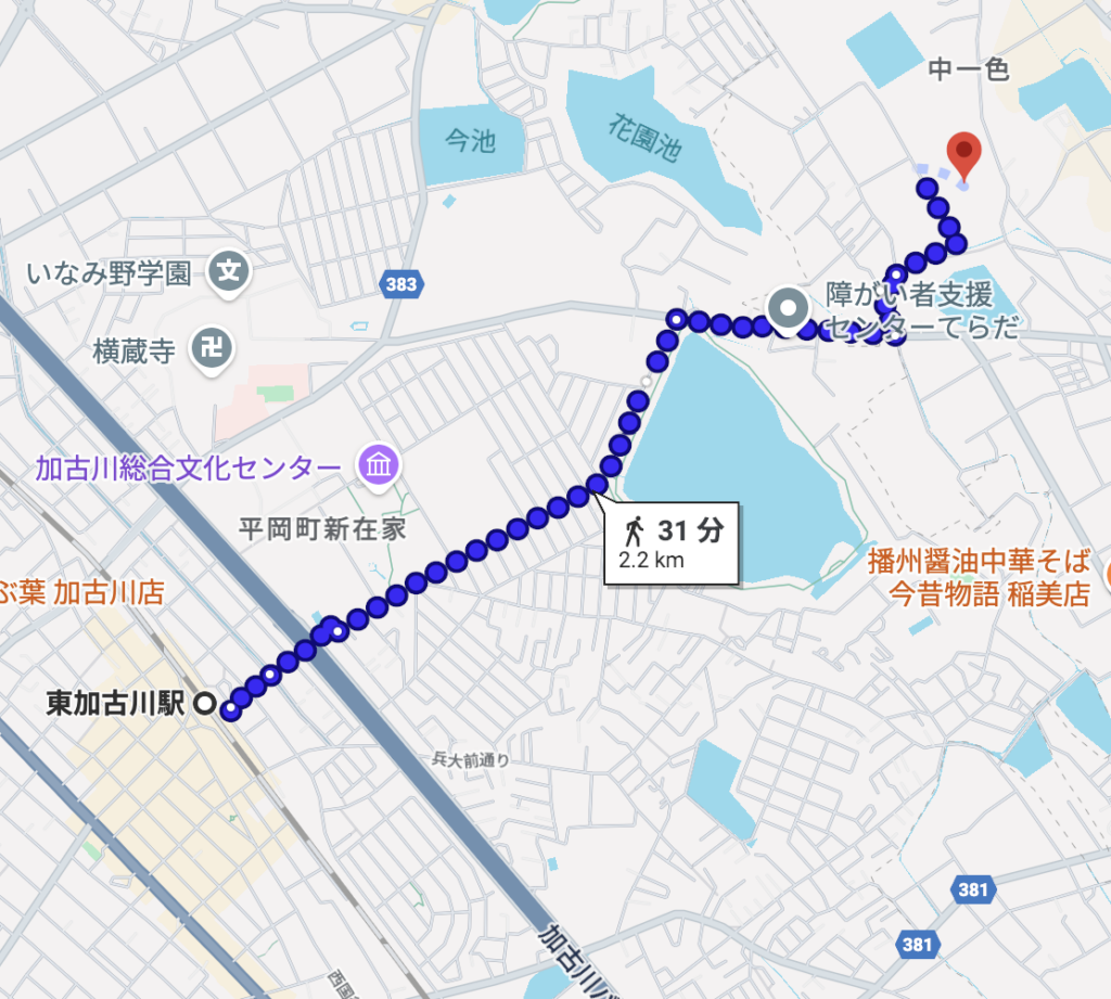 場所は、JR神戸線東加古川駅から約2.7km離れています。
