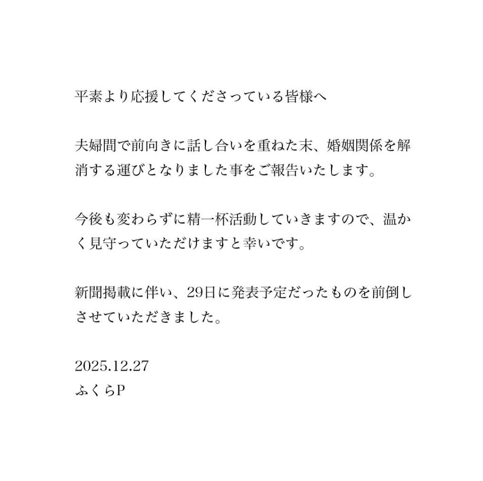 ふくらPさんは、27日に自身のXに離婚お知らせをポストしています。