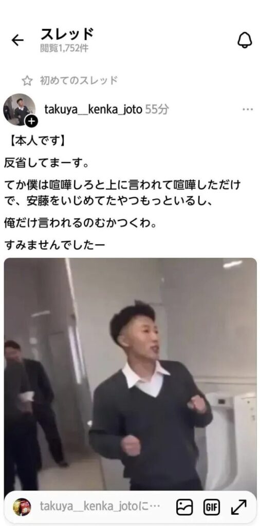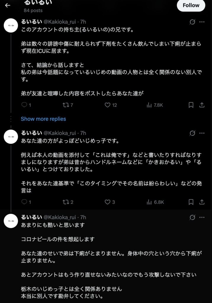 本人であると言う可能性もありますが、お兄さんと思われる人の後に投稿されたポストを見ると、いじめをやったやらないに関わらず、まず「いじめに見えてしまうことをしてすみません」と言う誠心誠意の謝罪はありません。