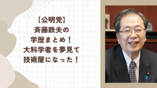 芸能 【公明党】斉藤鉄夫の学歴まとめ!大科学者を夢見て技術屋になった! 斉藤鉄夫氏は、公明党に30年以上所属する衆議院議員です。 彼の長年の経歴は、公明党にはなくてはならない存在なのではないでしょうか。 そんな彼の、プライベートについては注目をされています。 今回は、 学歴 幼少期からのエピソード についてまと... 2025.10.11 2025.10.12 芸能