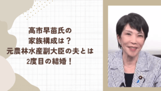 芸能 高市早苗氏の家族構成は?元農林水産副大臣の夫とは2度目の結婚! 自民党総裁選に選ばれた高市早苗氏のプライベートについて注目されています。 今回は、高市早苗氏の 家族構成 家族関係 についてまとめてみます。 高市早苗氏の家族構成は? 出典元:X ここでは高市早苗氏の家族構成をまとめてみます。 家族構成 高... 2025.10.05 2025.10.12 芸能