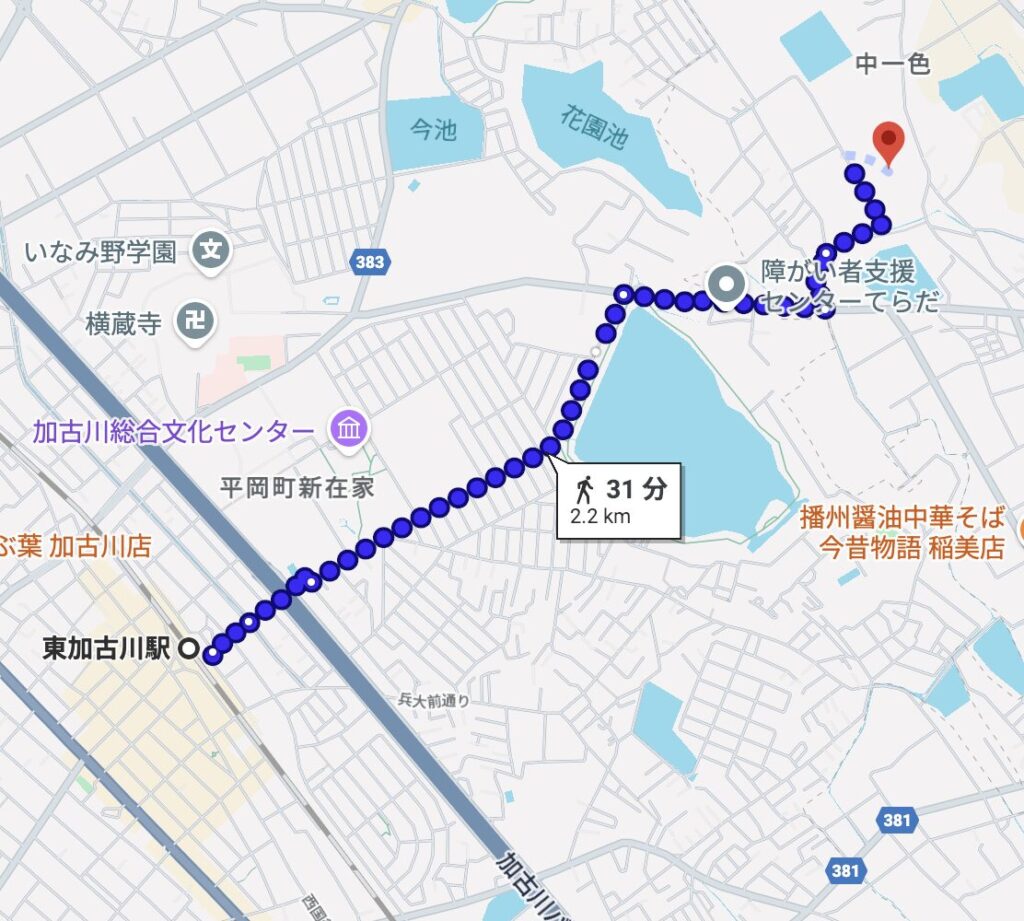 場所は、JR神戸線東加古川駅から約2.7km離れています。