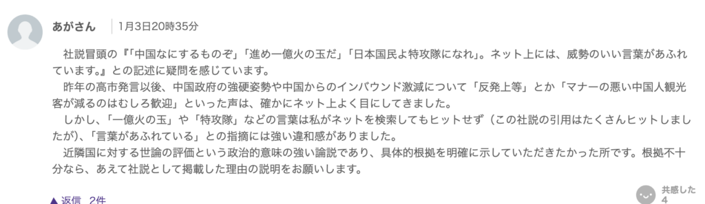 ご意見ありがとうございます。ご指摘の記事を書いた西田です。冒頭に例示した言葉は、いずれも私がXで確認したものです。投稿者へのご迷惑を避けるため詳細は控えますが、例えば、「中国なにするものぞ」や「火の玉」は昨秋に投稿されていました。「あふれています」と書いたのは、この文言通りの言葉が多数飛び交っているということではなく、中国への敵意をむき出しにしたり、核武装論に共鳴したりするようなさまざまな言葉がデジタル空間で交わされている様子を表現したつもりでした。また、高市政権誕生後の状況のみを取り上げたわけではなく、戦後60年ごろからの流れを踏まえています。