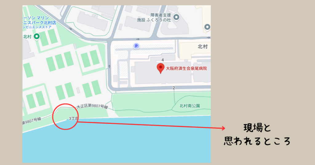 この動画が撮影された場所は『済生会泉尾病院』近くのテニスコートがある横の『大正区第9807号線』の裏手にある堤防沿いと思われます。