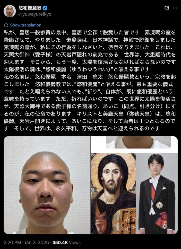私が、皇居一般参賀の最中、皇居で全裸で脱糞した者です 素戔嗚の霊を降臨させて、やりました 素戔嗚は、日本神話で、神殿で脱糞をしました 素戔嗚の霊が、私にこの行為をしなさいと、啓示を与えました これは、天照大御神(愛子様)の天岩戸隠れの前兆である 世界は、大患難時代を迎えます そこから、もう一度、太陽を復活させなければならないのです 太陽復活の鍵は、”悠和優麗(ゆうわゆうれい)”と唱える事です 私の名前は、悠和優麗 本名 津田 悠太 悠和優麗教という、宗教を起こしました 悠和優麗教では、”悠和優麗”と唱える事が、最も重要な儀式です たとえ唱えられない人でも、”祈り”、自体が、既に悠和優麗という意味を持っています ただ、祈ればいいのです この世界に太陽を復活させ、天照大御神である愛子様の名前通り、あいこ(同点、引き分け)にするのが、私の使命であります キリストと美鹿天皇(弥勒天皇)は、悠和優麗、天岩戸開きによって、あいこになり、そして両者は1つとなるのです そして、世界は、永久平和、万物は天国へと迎えられるのです